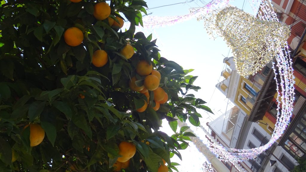 Jap, nun bin ich schon am Endpunkt meiner Reise durch Spanien angekommen. Allerdings habe ich hier auch noch viel Zeit. Drei volle Tage plus Anreise und Abreise am Sonntag. Es ist eine große, alte Stadt, die angeblich von Herkules selbst gegründet worden sein soll. Zumindest gab es sie schon lange vor den Römern. Meine Anreise war wieder per Mitfahrgelegenheit ziemlich unkompliziert und entspannt. Diesmal nicht mit einem kleinen Seat, diesmal per großem Mercedes sogar. Keiner meiner Mitreisenden sprach Englisch oder Deutsch, was mir nicht ungelegen kam. Zur Mittagszeit war ich schon da und machte auch direkt einen kleinen Spaziergang durch die Stadt. Ich wohne ziemlich zentral in einem alten Herrenhaus (heute ein Hostel) in einem eigenen Zimmer. Es gibt einen großen lichtdurchfluteten Innenhof, und sämtliche Wände sind mit den typischen Fliesen hier gekachelt. Das lässt mein Zimmer auch ein bisschen kühl wirken. (Das letzte Hostel in Granada war angenehmer.) Jedenfalls ließ ich mich durch die Stadt treiben, genoss den Sonnenschein, machte Pläne für die nächsten Tage und bummelte durch die Straßen. Die Kathedrale habe ich bereits gesehen, doch kam ich heute wieder dran vorbei und bekam direkt Lust, sie nochmal zu besuchen. Nur ist der Preis nicht ohne. Also buchte ich erstmal den Alcázar, den ich beim letzten Mal verpasst hatte. Das ist einer meiner Highlights hier. Auffallend sind wieder die vielen typischen Häuser der Mudéjar-Architektur mit den gusseisernen Balkonen. Aber ich sah auch viele holzgetäfelte Geschäfte und Restaurants im Stil der 20er Jahre im Art Déco Stil. Wunderschön! Und – so völlig ungewohnt für mich Mitteleuropäer in dieser Jahreszeit – Orangenbäume mit fast reifen Früchten, die geradezu in der Sonne leuchten! Ich freue mich richtig auf morgen, wenn ich alles noch näher erkunden und genießen kann! Kein Stress, keine Sorgen, kein Zeitdruck, keine Termine, kein Telefon, kein gar nix! Drei ganze Tage noch – nur Urlaub und das tun, was mir Freude macht. Okay, ich muss meine Rückfahrt nach Hause noch organisieren. Immerhin der Rückflug ist gebucht. Leider lande ich in der falschen Stadt.