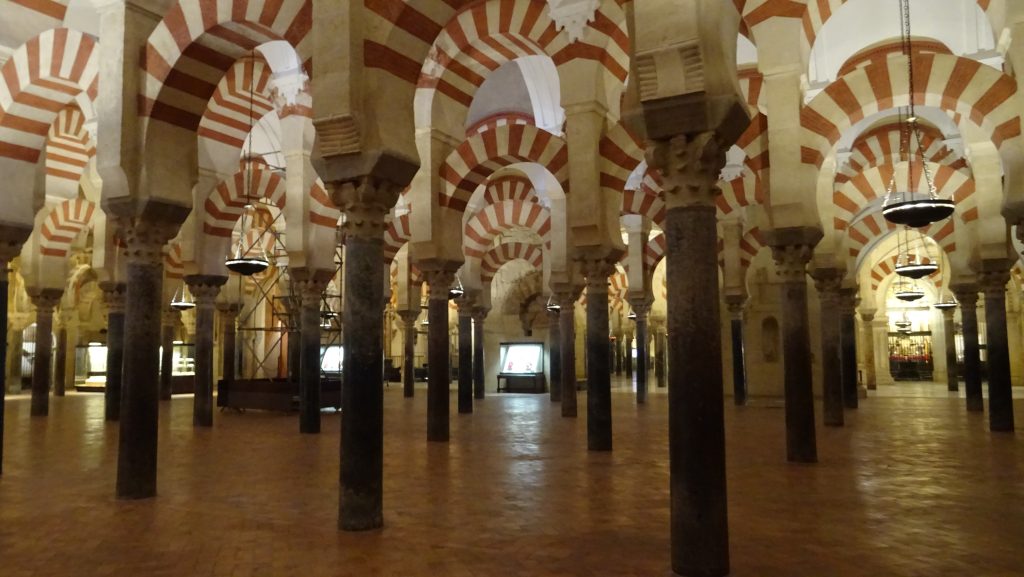 Die Mezquita-Catedral de Córdoba heute war natürlich das Highlight des Tages heute. Nachdem ich gestern jedoch gesehen hatte, wie voll es sein kann bzw. werden wird, bin ich extra früh aufgestanden, um sie zu besuchen. Und da heute Sonntag ist, machte sowieso alles andere auch am frühen Nachmittag bereits zu. Also stand ich früh auf und tappte durch den Regen zur Kathedrale. Und es war auch wieder sehr kalt. Eigentlich sollte man bei so einem Wetter im Bett bleiben. Doch ich bin nun einmal hier, dann muss es sich auch lohnen. Und siehe da, ich war sogar erst der 3. Besucher an diesem Morgen. So hatte ich sie fast für mich allein und kaum jemand lief mir ins Bild. Und so weitläufig die Moscheekathedrale auch ist, so waren doch kaum je mehr als 10 Menschen in meinem Sichtfeld. Und groß ist sie wirklich. 784 wurde sie als Moschee begonnen und über die Jahrhunderte regelmäßig erweitert. Heute wäre sie die drittgrößte Moschee der Welt. 1236 wurde die Stadt allerdings wieder durch die Christen von den Muslimen zurück erobert und die Moschee zur Kirche geweiht. 300 Jahre später baute man eine riesige Kathedrale in die Moschee hinein. Heute haben wir so eine einzigartige Kombination von maurischem und gotischem Stil sowie zwei Weltreligionen unter einem Dach. Diese halbrunden rot-weißen Bögen auf 856 Säulen, alle in Reihe und Glied ausgerichtet, dazwischen ein überaus reich ausgestattetes Kirchenschiff mit gotischem Rippengewölbe, diverse riesige alte Bilder und Kapellen, ein Kirchenschatz aus Gold und Silber, eine große alte Orgel, ein Minarett zum Kirchturm umgebaut und ein riesiger Arkadenhof mit Orangenbäumem – das muß man gesehen haben! Eine Mischung, eine Kombination, wie sie einzigartig auf der Welt ist. Völlig zu Recht ist sie seit über 40 Jahren UNESCO Welterbe. Also ich habe ja schon viele Kathedralen gesehen, doch so eine noch niemals.